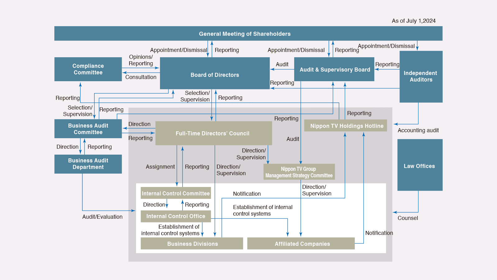 - As a consortium that has an Audit & Supervisory Board, the Company establishes a business management organization whose primary function is to supervise Board Members and Audit & Supervisory Board Members in their business executions.